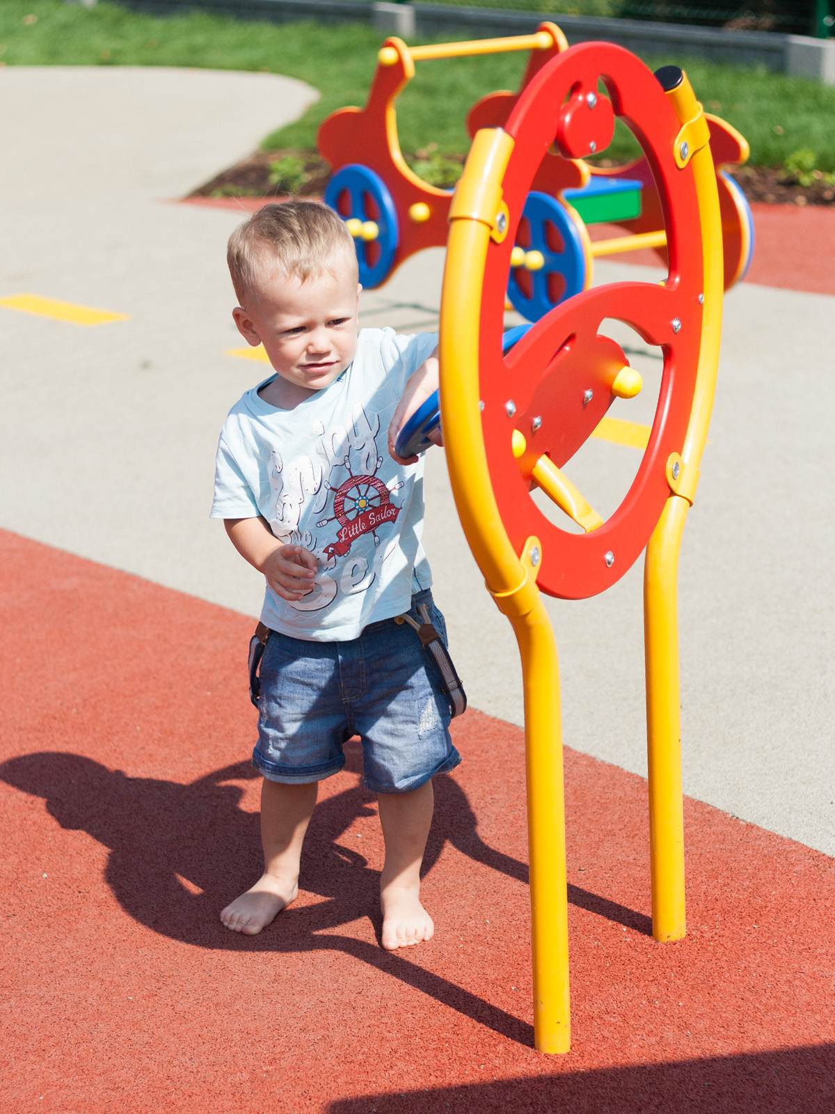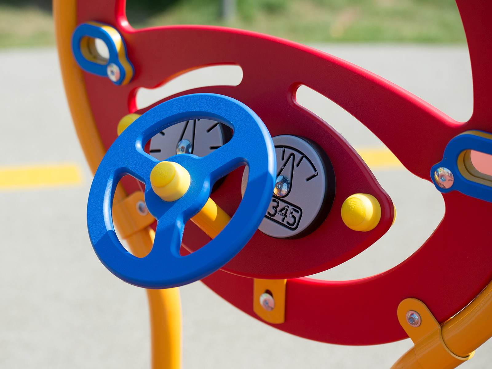 Nawet na placu zabaw można pobyć przez chwilkę kierowcą! Swoim fantazyjnym kształtem, estetycznym wykończeniem zachęca do wytrwałosci w zabawie, podnosząc tym samym poziom sprawnosci manualnych, kordynacje wzrokowo-ruchową i umiejętność skupienia uwagi. Elementy stalowe zabezpieczone antykorozyjnie poprzez cynkowanie i lakierowanie proszkowe, elementy manipulacyjne z wytrzymałego na warunki atmosferyczne HDPE.
