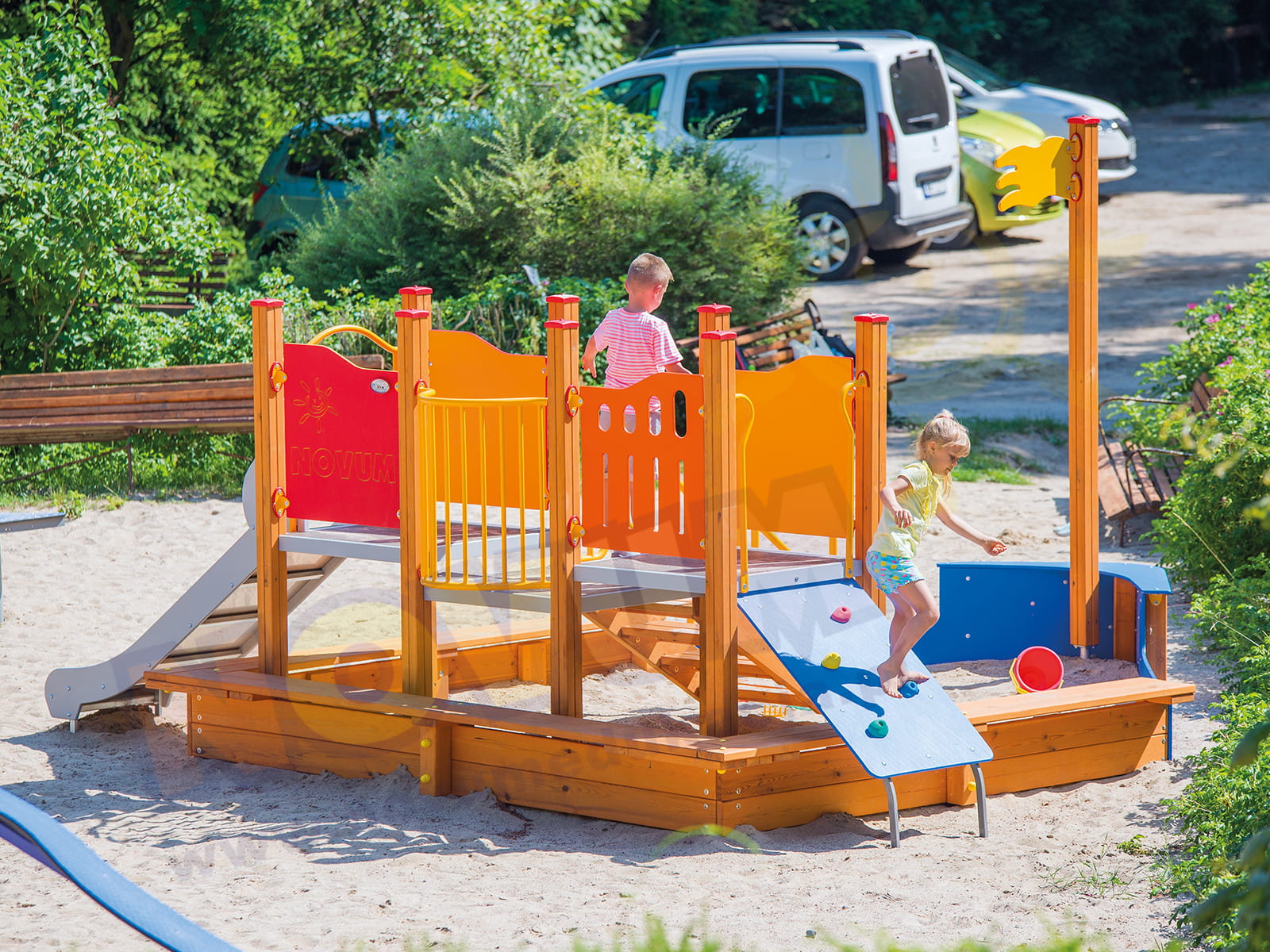 Zestaw dla maluchów. Duża piaskownica z długim i szerokim obrzeżem, na którym można stawiać babki będzie na pewno oblegana przez maluchy. Pokonanie ścianki wspinaczkowej to niewątpliwie wyzwanie dla umiejętności sprytu i sił najmłodszych, ale nagrodą za ich pokonanie będzie możliwość zjechania po niewysokiej zjeżdżalni. Kolorowy zestaw uatrakcyjni każdy żłobkowy czy przedszkolny plac zabaw.