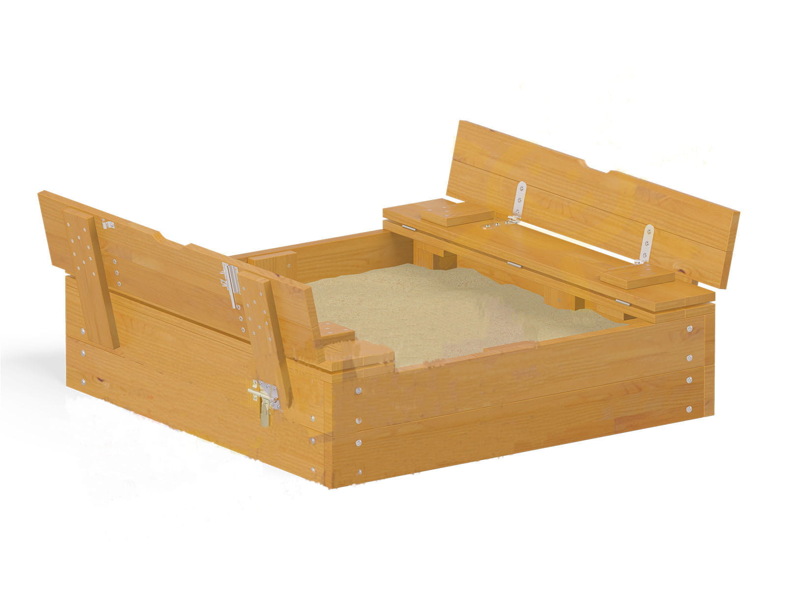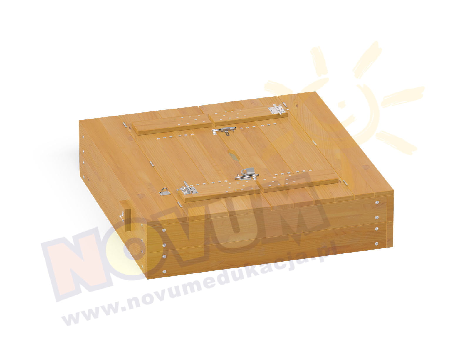 Niewielka, drewniana piaskownica z przykryciem. Drewniane wieko chroniące piaskownicę przed zwierzętami po rozłożeniu staje się ławką z oparciem, na której można się wygodnie rozsiąść podczas zabawy. Niskie boki ułatwiają wejście do piaskownicy, co sprawia, że idealnie sprawdzi się w żłobkach.