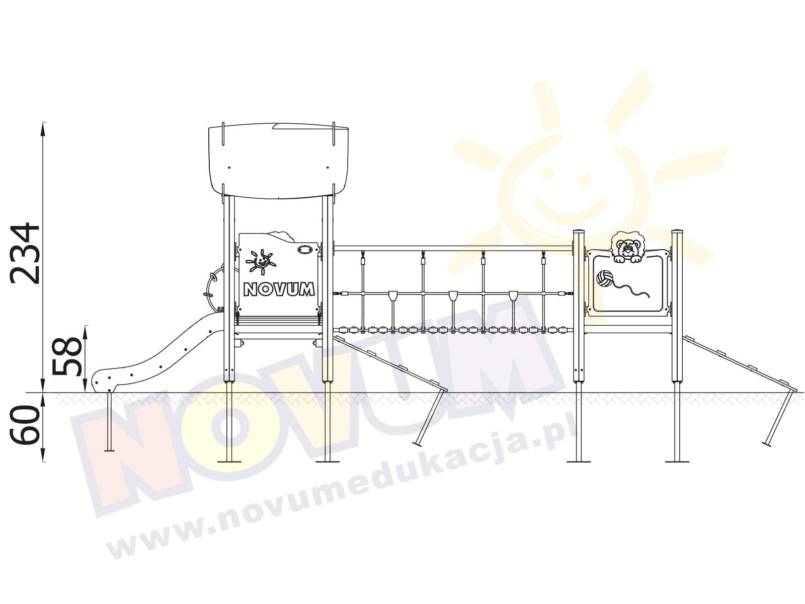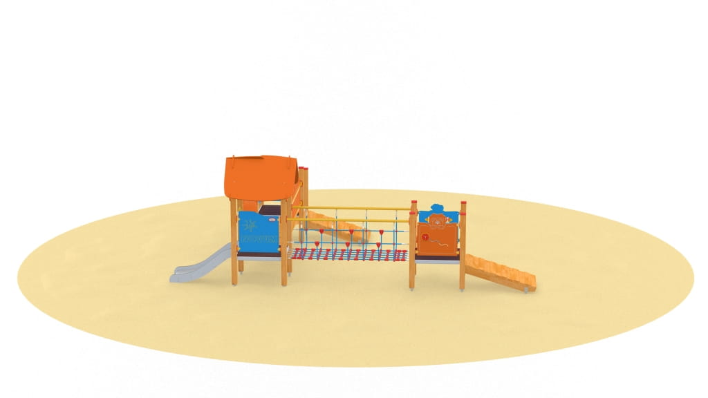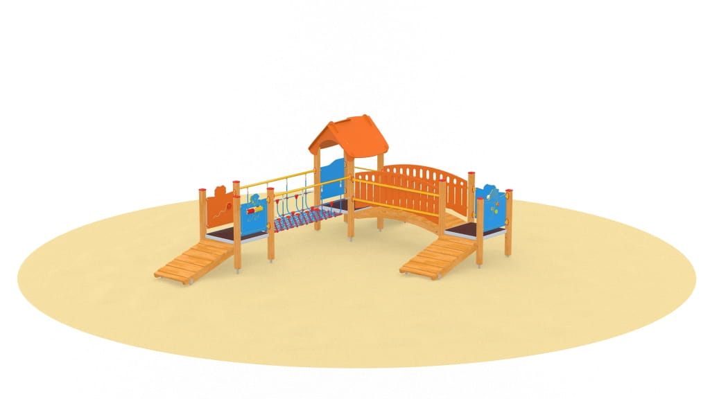 Centralnym punktem zestawu jest wieża ze zjeżdżalnią. Wiodą do niej 2 pomosty: łatwiejszy do pokonania, łukowy zabezpieczony pełną barierą i linowy, wymagający większej sprawności i lepszej koordynacji. 4 kolorowe zabezpieczenia z elementami manipulacyjnymi zachęcają do zabawy. Zestaw doskonale sprawdzi się zarówno w przedszkolu jak i na osiedlowym placu zabaw.